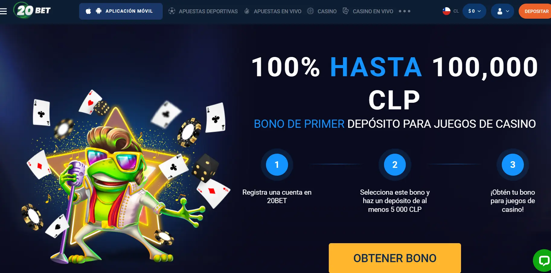En el casino online 20Bet, los nuevos jugadores pueden disfrutar de un bono del 100% de 100.000 CLP + 120 giros gratis (0,0010 BTC). El bono se activa automáticamente al depositar. La apuesta estándar es de x40, pero algunas tragamonedas permiten x5, y algunas promociones permiten apostar el bono incluso sin apostar.