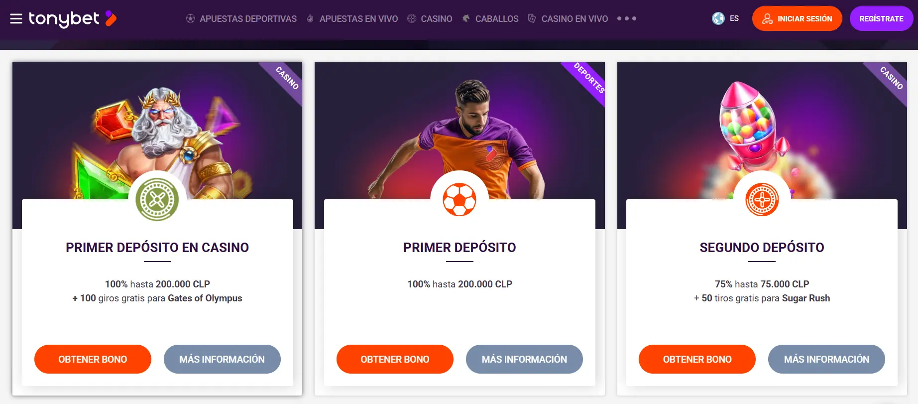 | TonyBet | 100% hasta 200.000 CLP + 120 giros gratis | x50 para casino dentro de 30 días | 5.000 pesos chilenos |