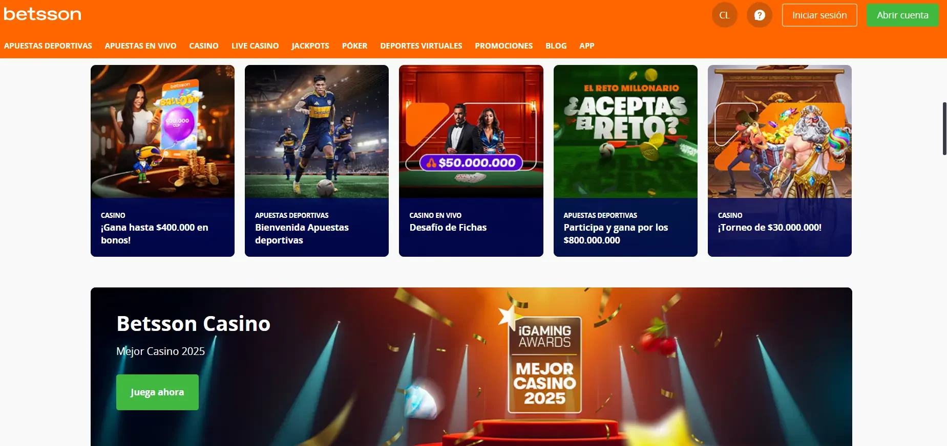 | Betsson | CLP 400.000 + hasta 200 giros gratis | Depósito mínimo: desde CLP 9.500. Requisito de apuesta: 35x. Los giros gratis se entregan en partes. |